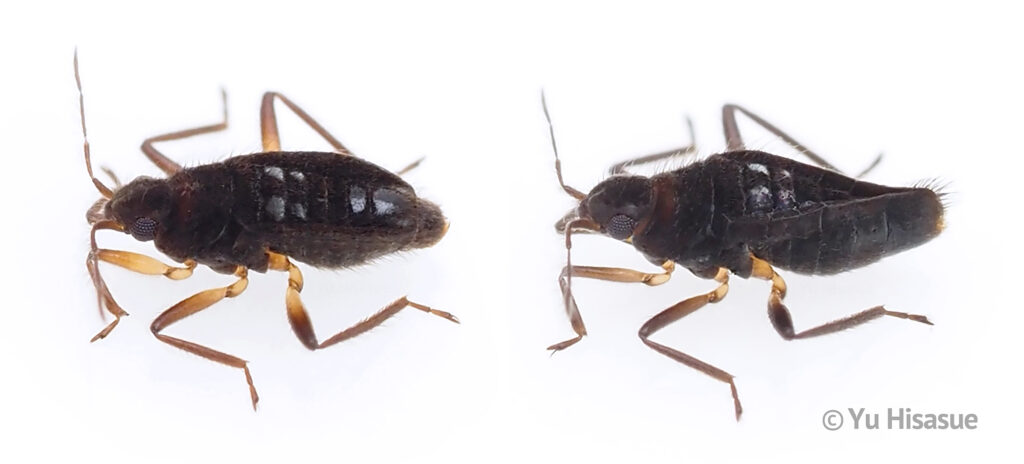 イルカケシカタビロアメンボのオス(左)とメス(右)、撮影・提供:久末遊