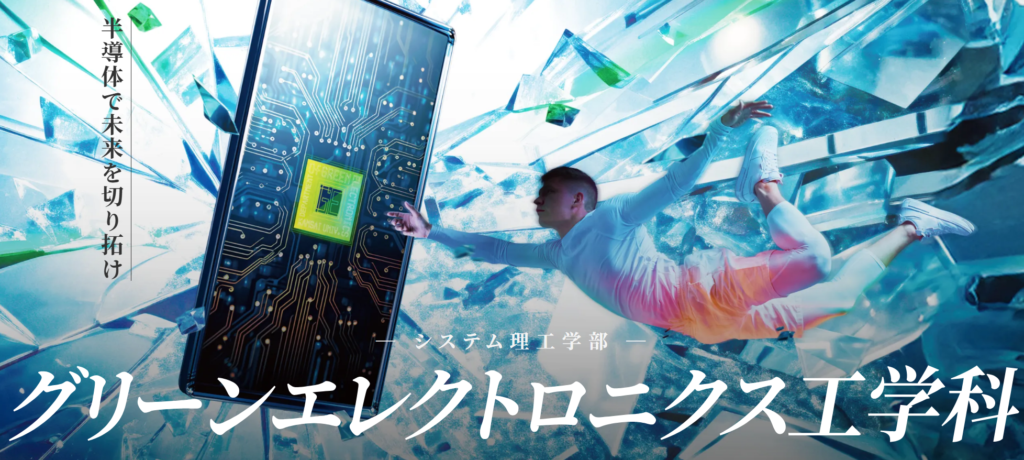 学生は半導体の設計、製造、集積回路やソフトウェア技術まで網羅的に学ぶ。基礎・専門科目で「グリーンエレクトロニクス概論・応用」を学習することで、半導体技術がどのように環境問題に関わるのかを勉強していく。定員は62人。