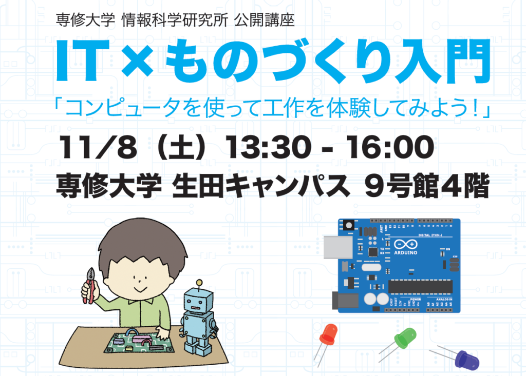 ポスターより 専修大学(東京都・千代田区)は11月8日に、公開講座「IT×ものづくり入門」を生田キャンパス9号館4階で開催する。電子工作キット「アルドゥイーノ」を使ってLEDランタンを作り、プログラミングを行うことでさま […]