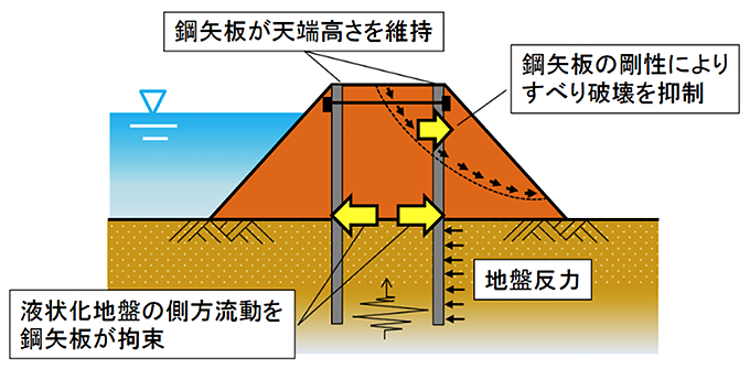 鋼材を用いた補強工法のうち、ため池の防災工事として施工実績を有する「鋼矢板二重式工法」は、堤体内に鋼矢板を二列打設して、鋼材の頭部同士をタイ材(鋼矢板の上部に取り付けられ、他の鋼矢板と連結するために用いる鋼製部材)で連結する工法。二列の鋼矢板とその間に囲まれた堤体を一体化させることで、耐震性能が向上する。さらに、鋼矢板が壁体となることから、堤体の遮水性能が向上する。