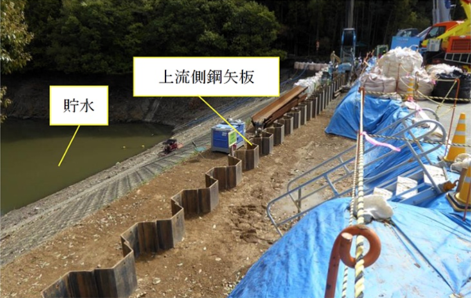 鋼材を用いた補強工法のうち、ため池の防災工事として施工実績を有する「鋼矢板二重式工法」は、堤体内に鋼矢板を二列打設して、鋼材の頭部同士をタイ材(鋼矢板の上部に取り付けられ、他の鋼矢板と連結するために用いる鋼製部材)で連結する工法。二列の鋼矢板とその間に囲まれた堤体を一体化させることで、耐震性能が向上する。さらに、鋼矢板が壁体となることから、堤体の遮水性能が向上する。