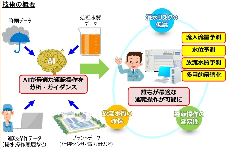 AIを用いた分流式下水道における雨天時浸入水対策支援技術は、雨天時に増加する下水の流入水量予測等を行い、短時間の水量変動に応じた下水処理場における望ましい運転操作等のガイダンスを行う技術。実証研究では、ポンプの省エネ運転、下水処理場設備の浸水リスク低減などの効果を確認している。