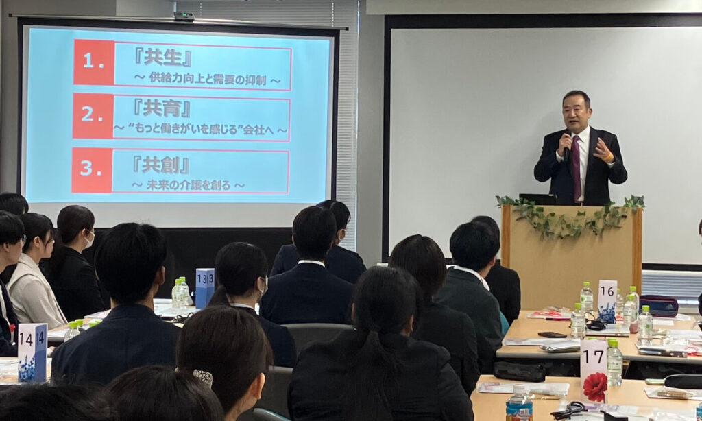 SOMPOケアは今月1日に新年度の新卒入社式を開催した。テーマは「AI共創」。介護現場のイノベーションへの挑戦を色濃く打ち出す構成となった。