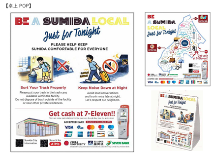 この4月1日に施行した「墨田区住宅宿泊事業の適正な運営に関する条例」を契機として、東京都墨田区と協定を締結する千葉大学は㈱セブン‐イレブン・ジャパンと連携し、民泊宿泊施設等に設置する外国人宿泊者向けの卓上POPを制作した。近隣トラブル事例の多いゴミ出しのルールや夜間騒音への配慮についてマナーの啓発を促すデザインとし、かつ、区の魅力を紹介する簡易マップを裏面に記載することで、観光客に伝えやすいデザインとしている。制作にあたっては、千葉大デザイン・リサーチ・インスティテュートの知見を活用し、㈱セブン銀行の協力により印刷を行った。