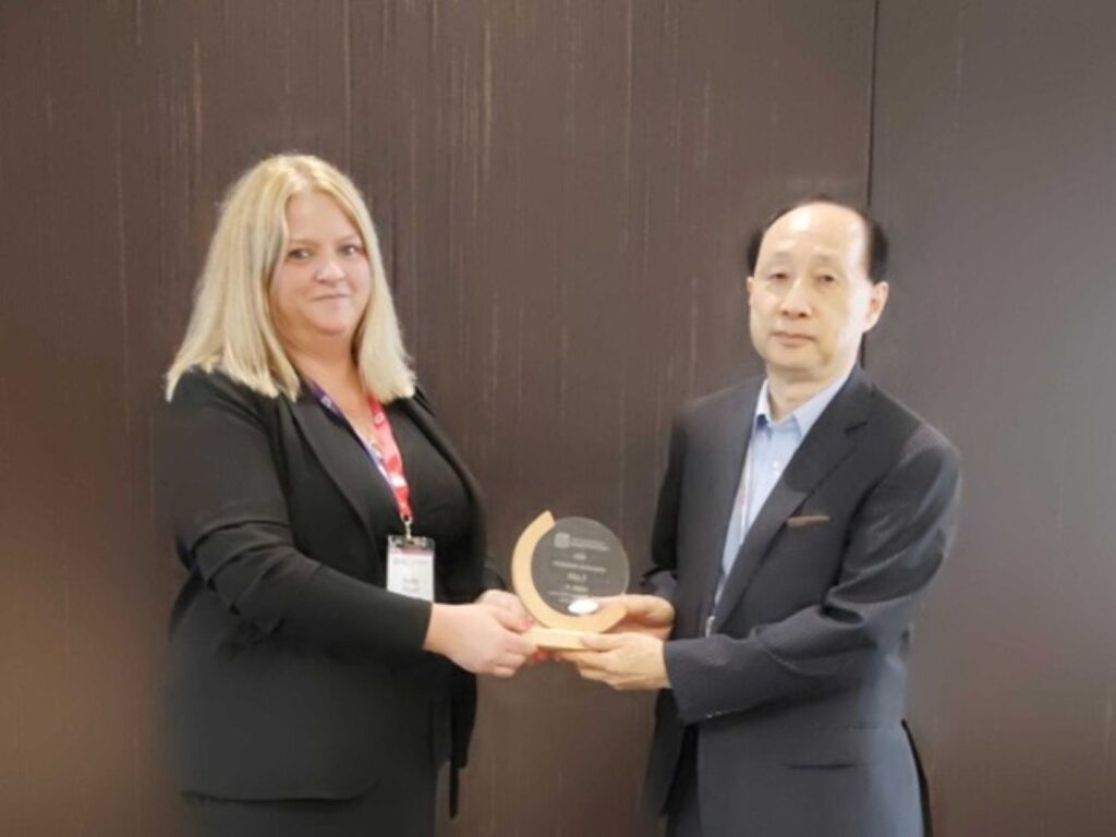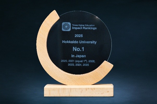 こうした成果を称え、今年夏に愛知県名古屋市で開催された「THEインパクトランキング・マスタークラス2025」の会場で、THEのチーフレベニューオフィサー(CRO)のポリー フライヤー氏から、北大が令和2年から6年連続で国内1位を獲得したことを記念する楯が授与された。授与式には、北大統合URA本部副本部長の阿部 弘副理事が出席し、楯を受け取った。