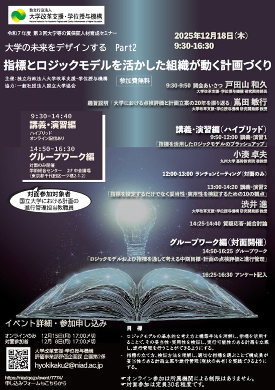 大学改革支援・学位授与機構は、12月18日㈭に、学術総合センター(東京都千代田区)で令和7年度第3回大学等の質保証人材育成セミナー「大学の未来をデザインするPart2―指標とロジックモデルを活かした組織が動く計画づくり」を開催する。9月に開催したセミナーの続編として、実行可能性の高い計画立案・進行管理の実践と、設定した指標の妥当性・実用性を検証する方法について、より発展的な内容を取り上げる。