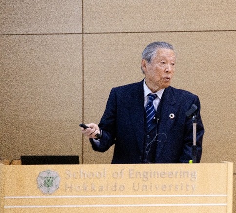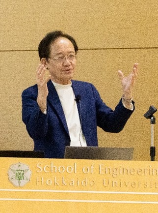 基調講演では、川添雄彦氏(NTT株式会社チーフエグゼクティブフェロー)が、『AI技術の急速な進展と、それを支える最先端技術について』と題して講演。続いて、寳金清博北大総長から大学が果たすべき役割を、山口淳二北大総括理事・副学長(半導体フロンティア教育研究機構長)から北大での半導体教育・研究推進の取り組みが紹介された。